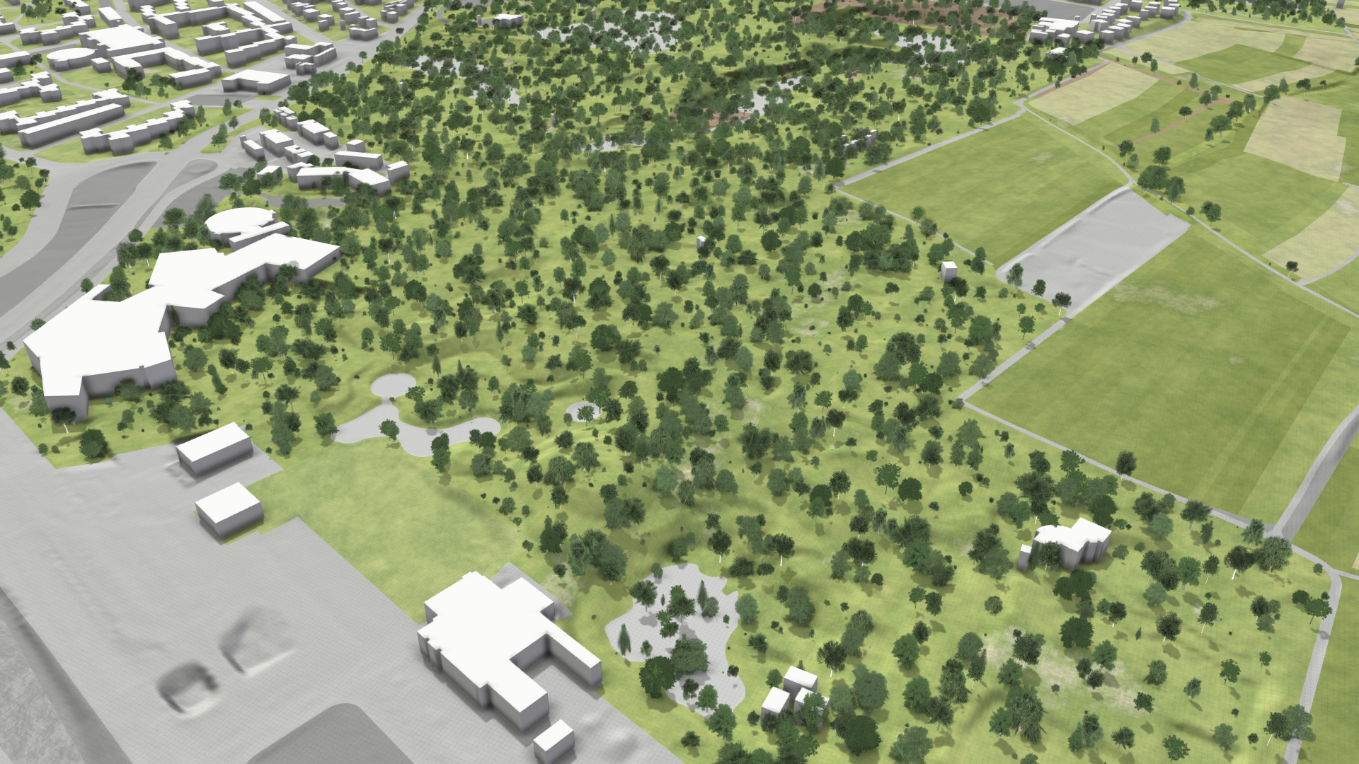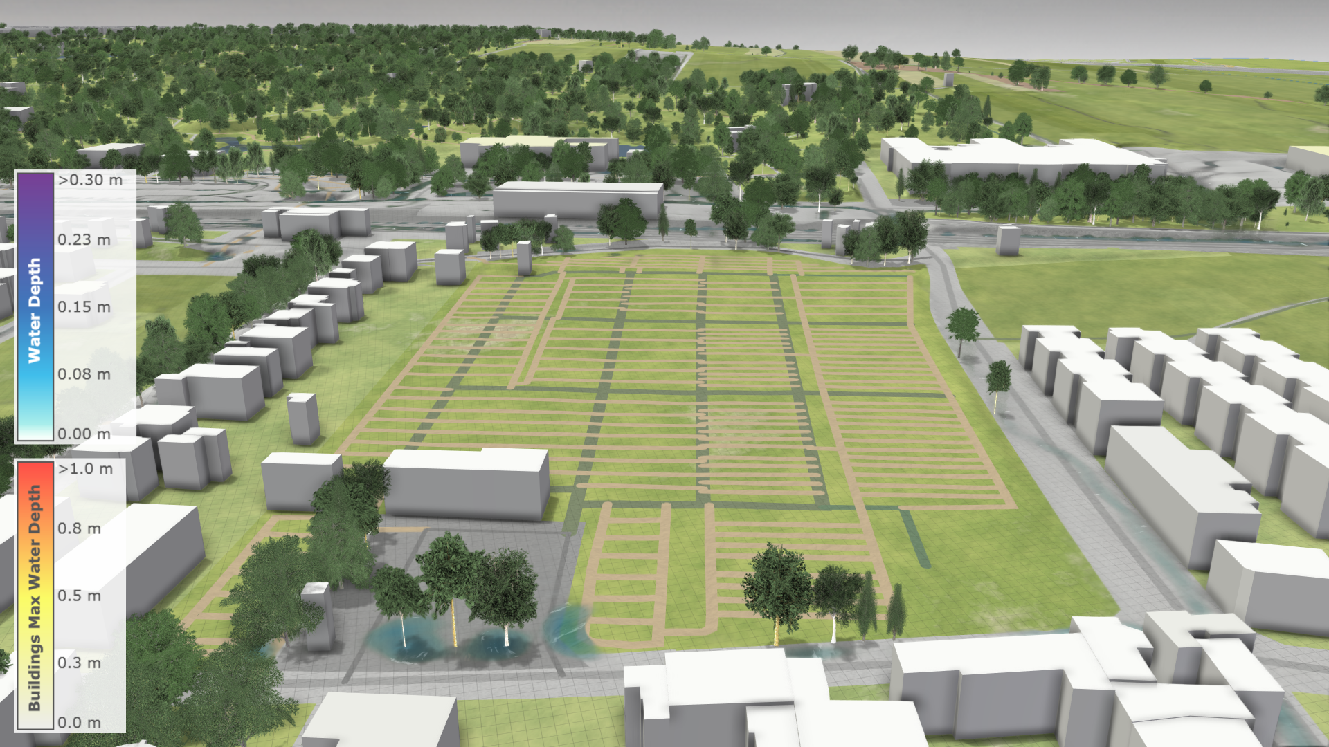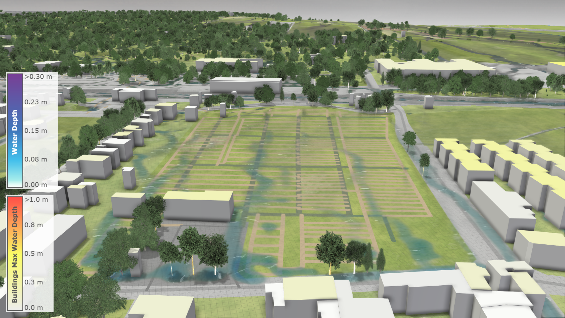 Buildings play a crucial role in river flood and stormwater simulations. They act as physical barriers for water flow, intercept rain, and provide visual context.