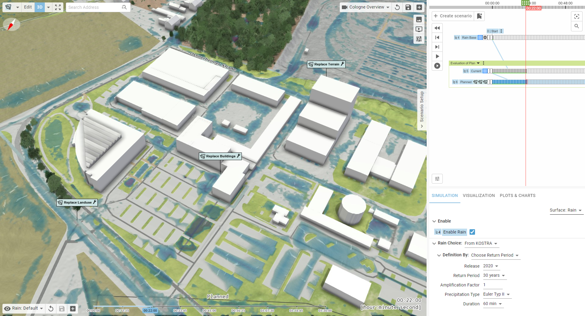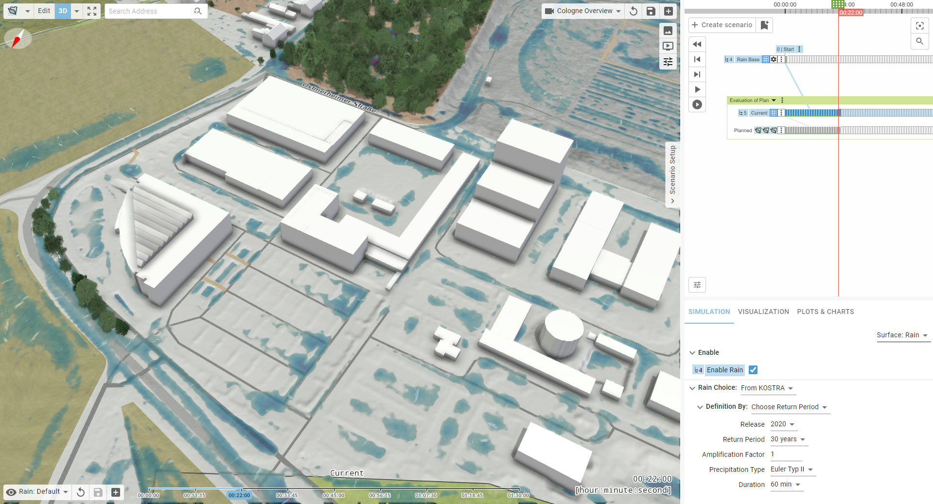 - Current Status Scenario: This scenario reflects the existing conditions. Start by drawing a Simulation Domain in the study area and set up rain parameters, for example, by auto-deriving rainfall data from the KOSTRA dataset.