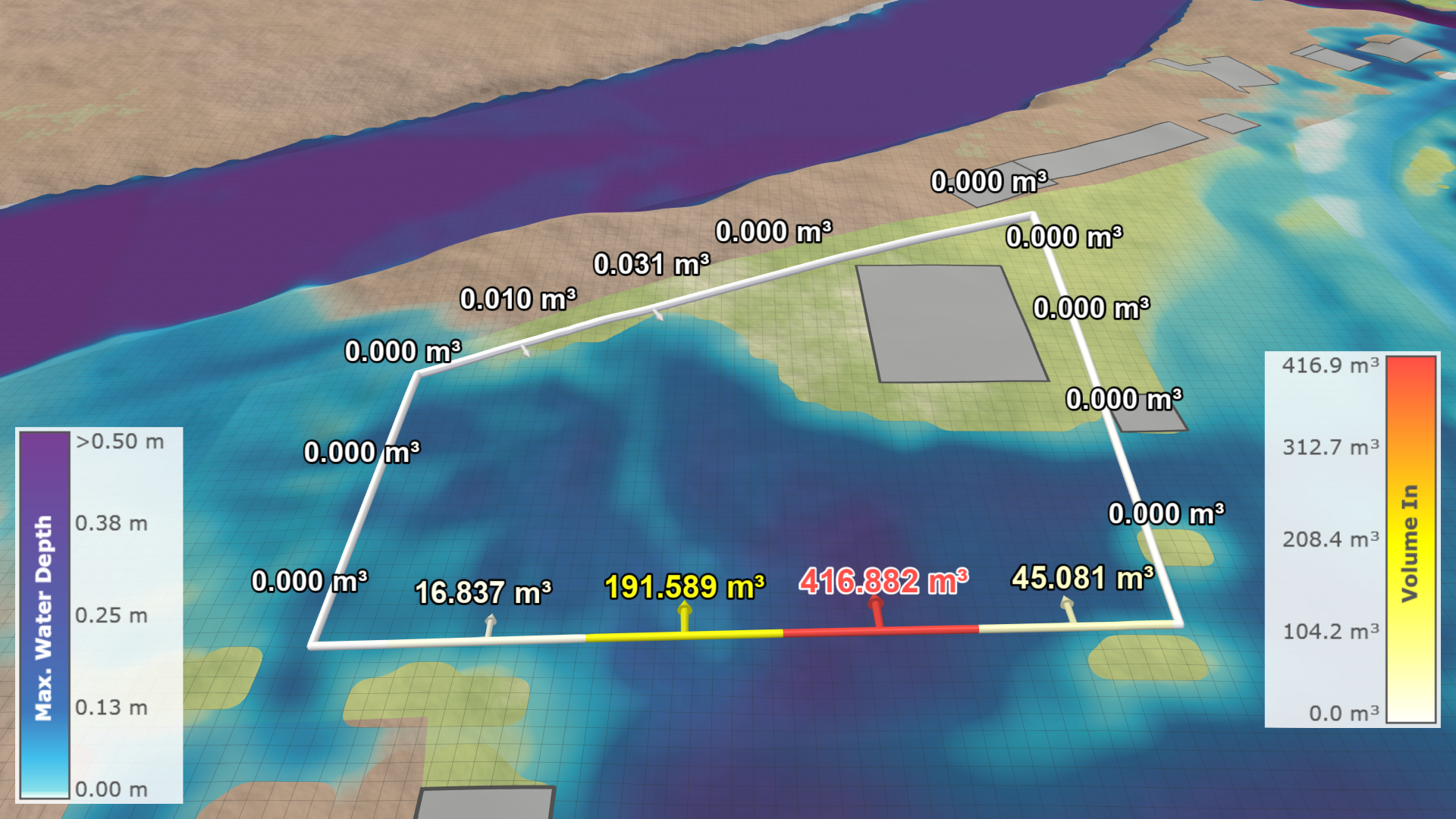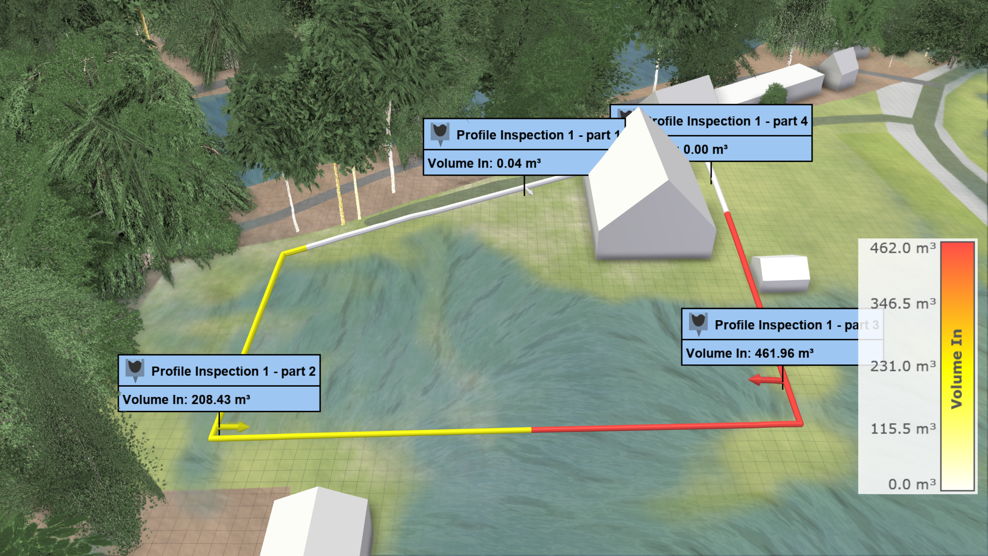 By default, all values are calculated along the whole profile line. If you want to focus on subsections, the line can be divided according to the subdivision length of the action settings. This option must also be enabled in the Action Settings Panel. The visual preset Surface: Subdivided Profile Discharge is useful for many subdivisions, as it displays smaller labels that do not overlap. The following examples show the inflow volume of water to a premises (Volume In) represented by a closed inspection line.