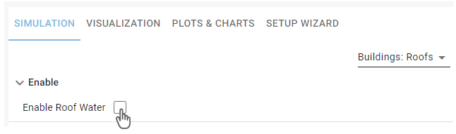 In order to compute the roof's access volume and discharge, the roof water simulation has to be enabled in the Simulation Settings Panel under Buildings: Roofs.