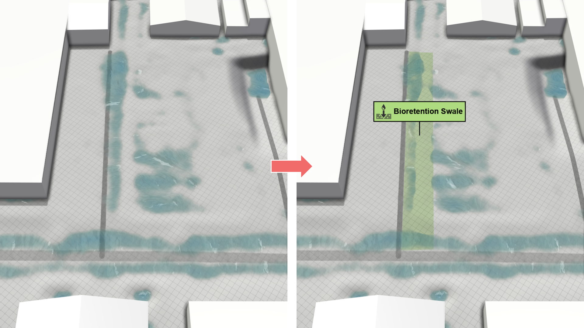 Purpose and Effect: This action is part of the nature-based solutions action set. It enables users to create a zone with enhanced infiltration properties, designated storage, and a constant loss rate. Bioretention swales typically feature an engineered soil mix to promote infiltration.