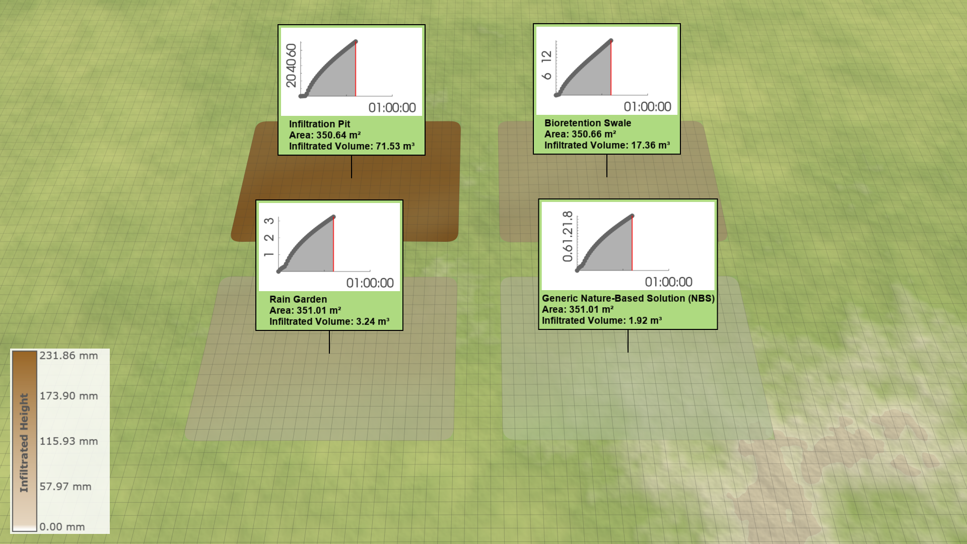 The primary difference from the generic nature-based solutions is that the default parameters are configured to reflect the infiltration properties commonly found in materials used for rain gardens.