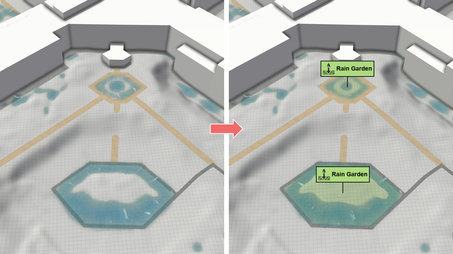 Purpose and Effect: This action is part of the nature-based solutions action set. It allows users to create a zone with enhanced infiltration properties. It may feature a designated storage and a constant loss rate. Rain gardens are typically filled with aggregate or other porous materials to promote infiltration.