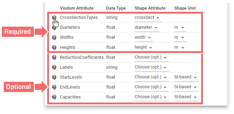 It is necessary to map shape attributes to the four required attributes CrossSectionTypes, Diameters, Widths, and Heights in the Action Tool Panel. Other attributes are optional and do not need to be provided. Details about individual attributes are provided as inline help, which can be displayed via mouse click, as shown for the CrossSectionTypes below.