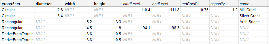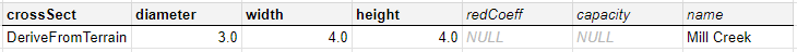 CrossSectionTypes Positive values (not NULL) Circular Diameters Rectangular Widths, Heights DeriveFromTerrain Widths, Heights