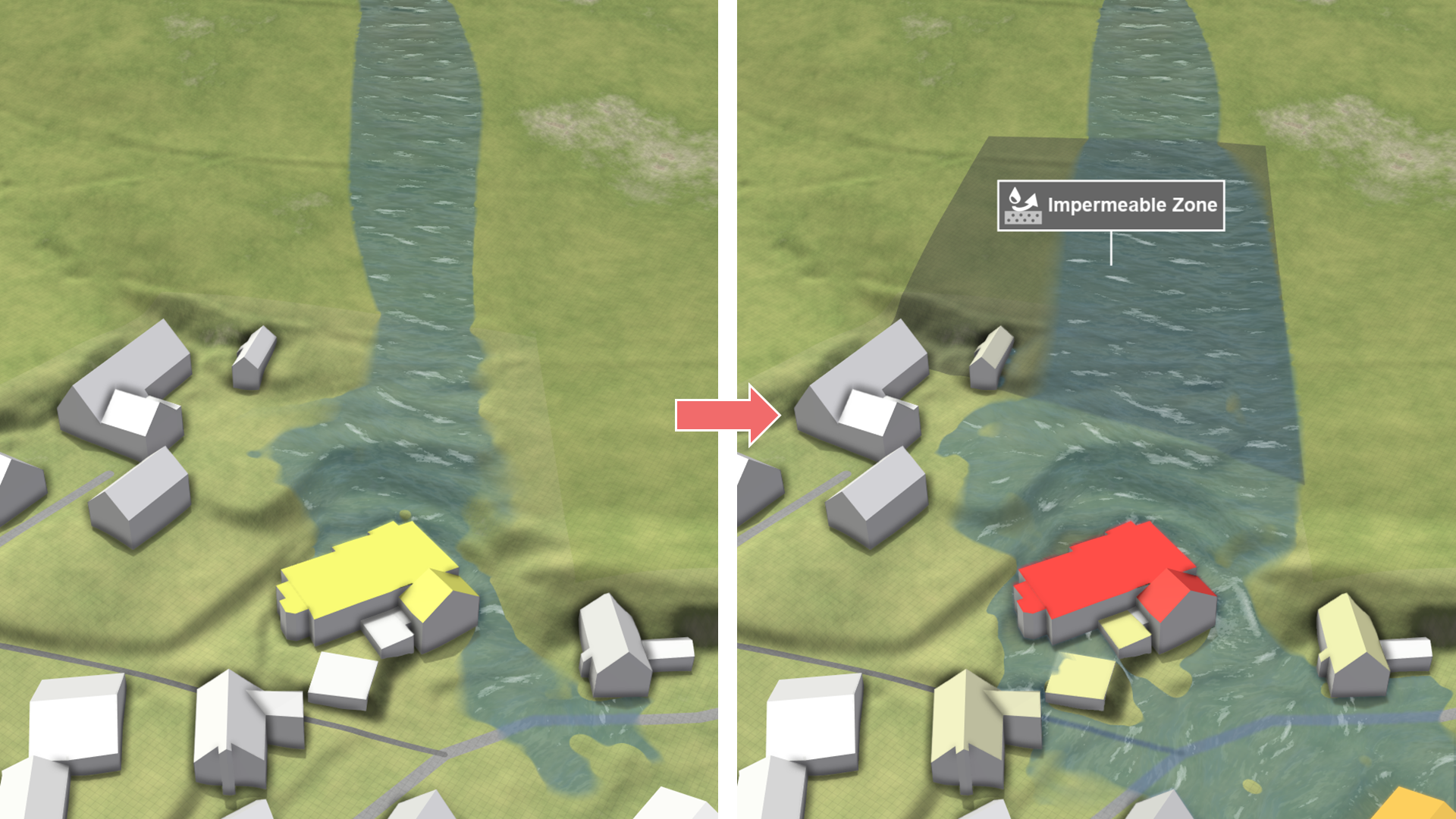Purpose and Effect: This action enables users to create zones that are impermeable to water. Since impermeable zones do not retain water through infiltration, they lead to rapid surface runoff and increase the risk of flooding. These zones can be used to model urban areas, roads, or other surfaces where infiltration is minimal or non-existent.