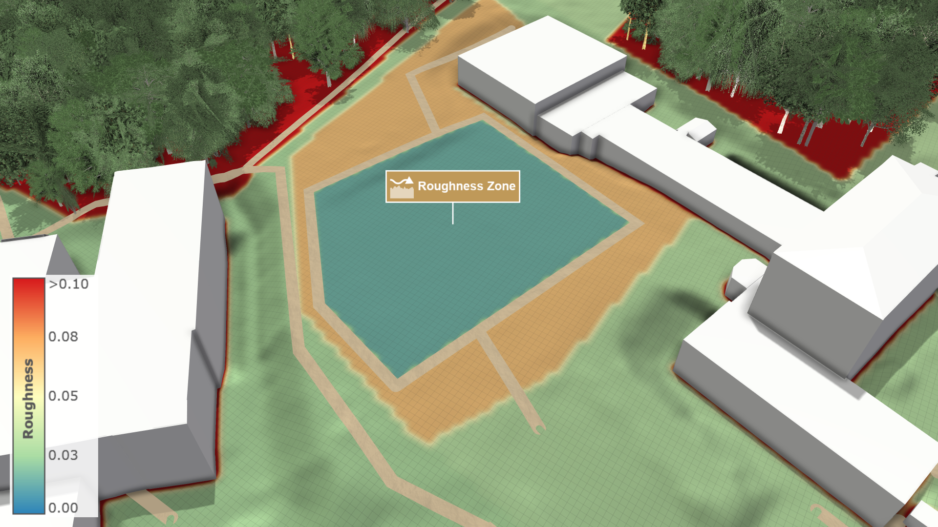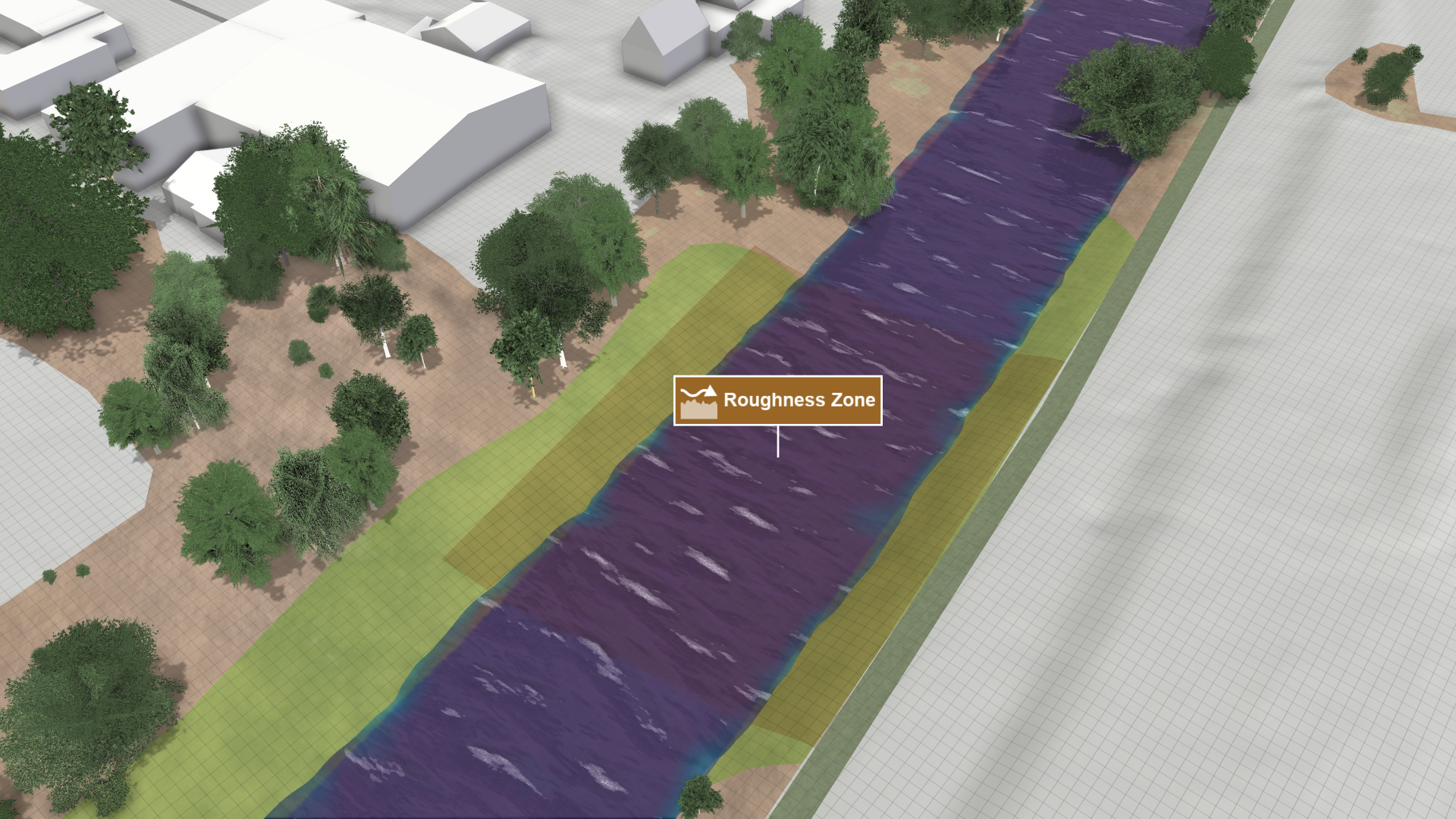 Purpose and Effect: This action enables users to specify surface roughness within a designated zone, affecting how water flow is simulated across different surfaces. In the Action Settings Panel, the Gauckler–Manning coefficient can be adjusted for each zone, allowing users to locally calibrate river beds and other surfaces. For more details on the roughness model, see Roughness.