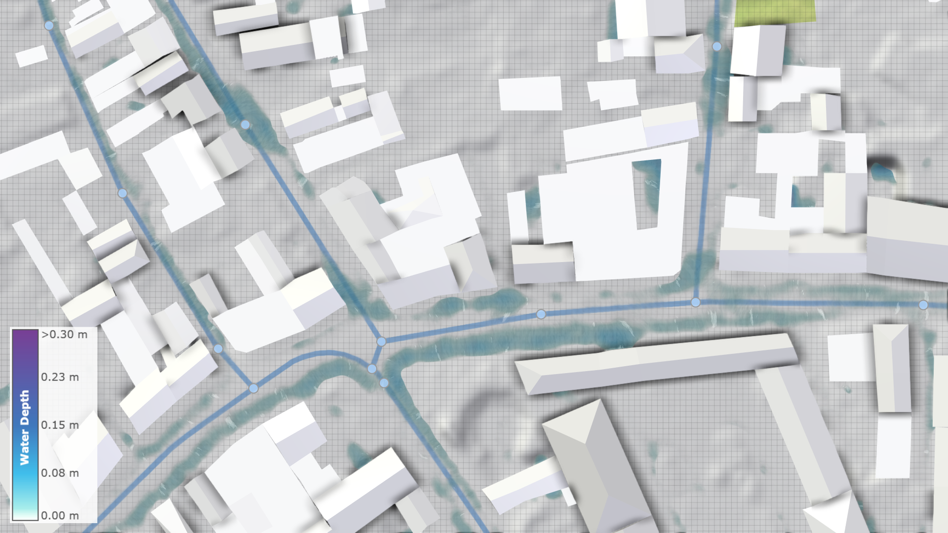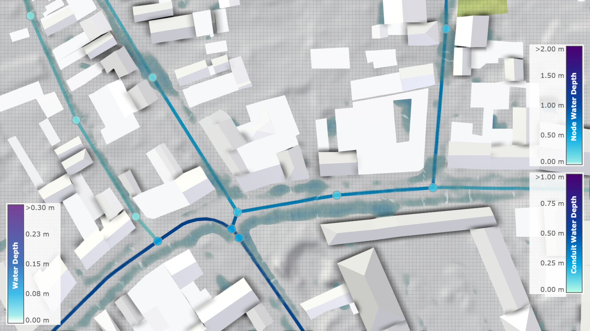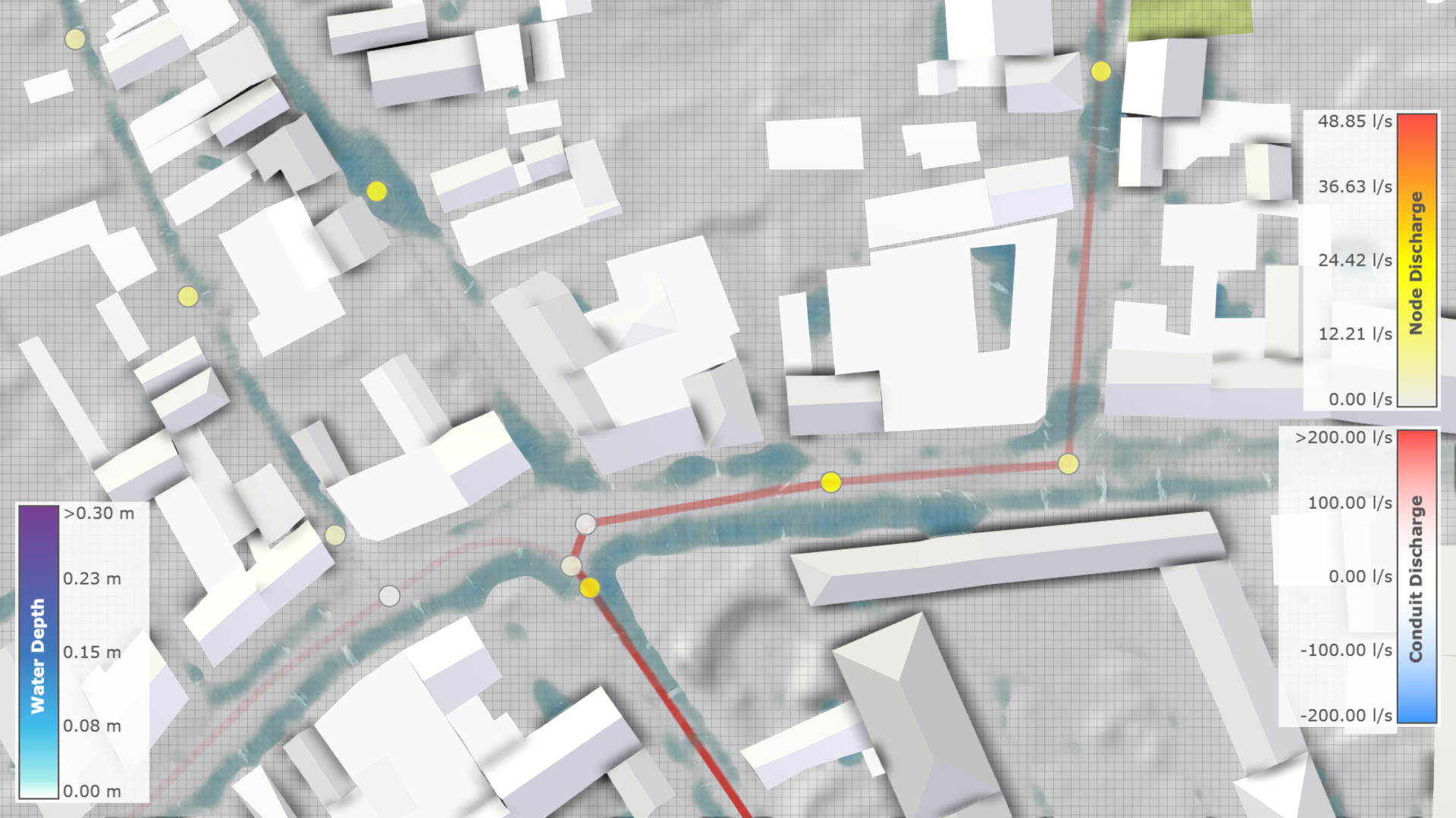 This preset shows the main sewer structures, nodes and conduits, as 2D projections on the terrain. It provides their visibility above the terrain and gives an overview of their fill levels, indicated by color.