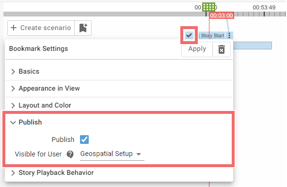 Bookmarks can be used to navigate between different simulation and visualization states by clicking on them. To make a bookmark part of a story and visible in the story bookmarks section, it has to be added manually. Enable Publish in the bookmark setting and select the User Model that should have access. A checkmark next to the bookmark indicates that it is added to the story.