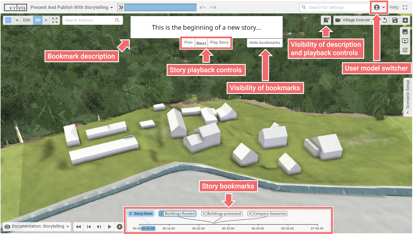 In the bookmark settings, you can rename the bookmark and add a description, which is displayed during story navigation. By default, bookmarks are linked to the active scenario and time step, but these parameters can be adjusted in the settings. Camera and visual presets can also be modified there.